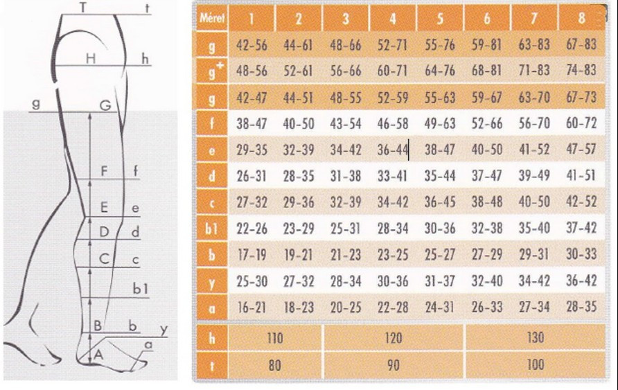 mérje meg a boka, valamint a vádli legvastagabb részének a kerületét és a táblázatból nézze ki a megfelelő méretetet 1-8 között.